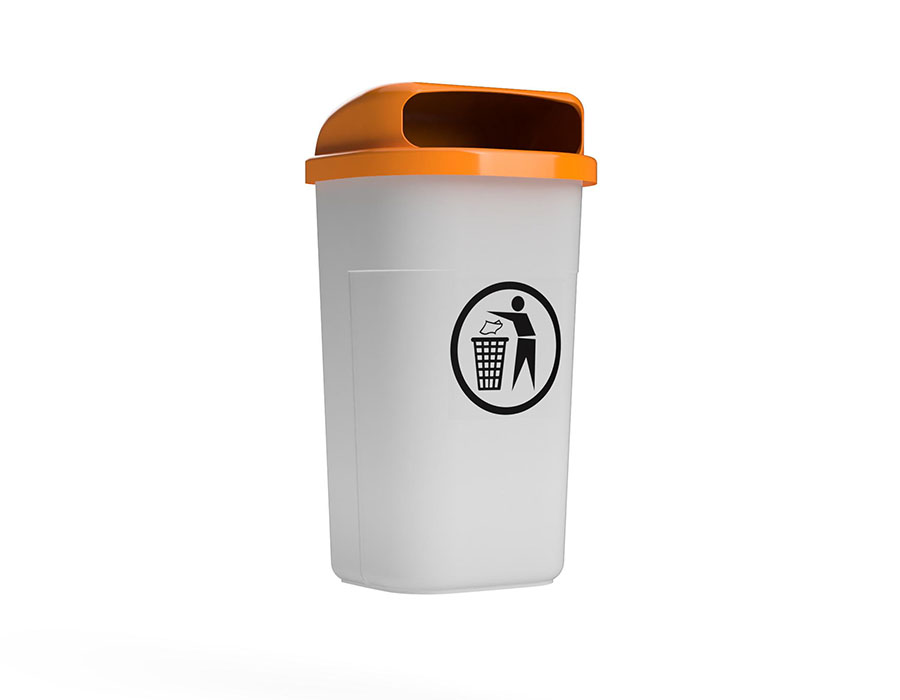 Papierkorb aus Polyäthylen, Grösse 44 cm, Volumen 50 l, Farbe grau und orange, Wandmodell.