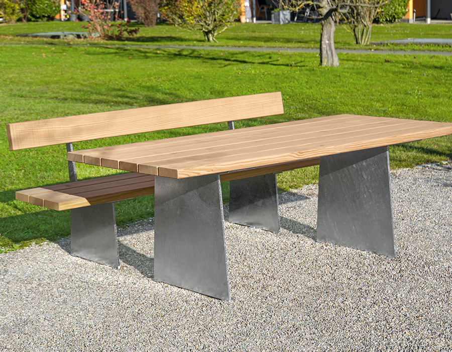 Parktisch Teret aus Schweizer Lärche roh, Länge 200 cm, Konsolen aus Stahl feuerverzinkt.
