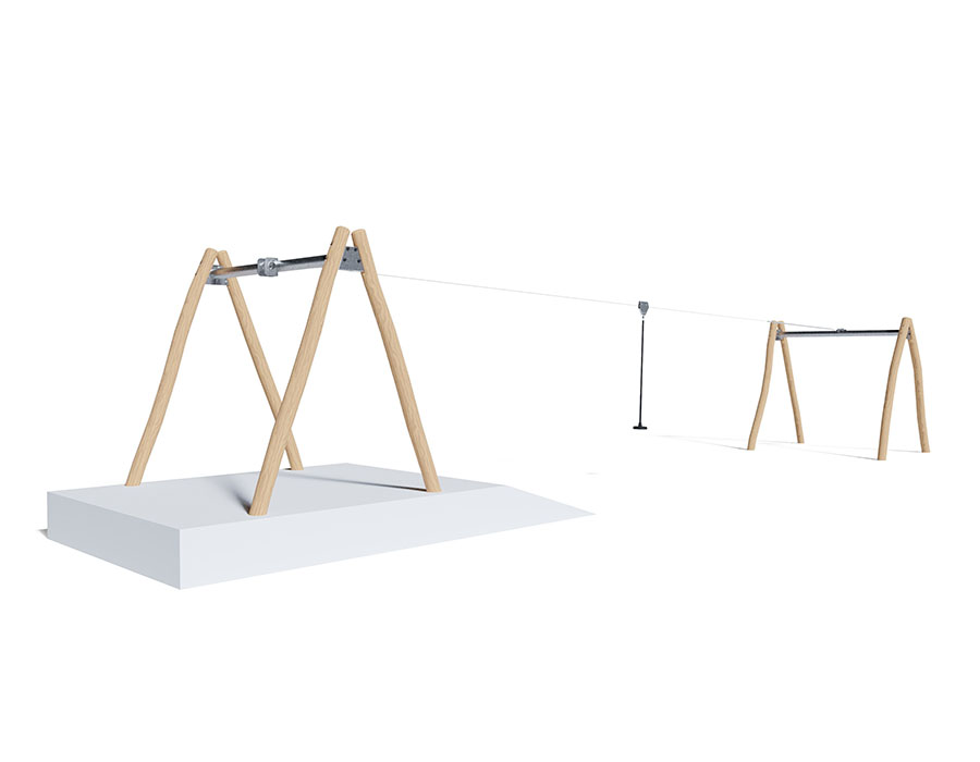 Seilbahn aus chemisch unbehandeltem Robinienkernholz geschliffen, Seilbahnlänge 15.00 m, für natürliches Gefälle von 4 %, mit Pendelsitz, minimale Einbautiefe 80 cm.