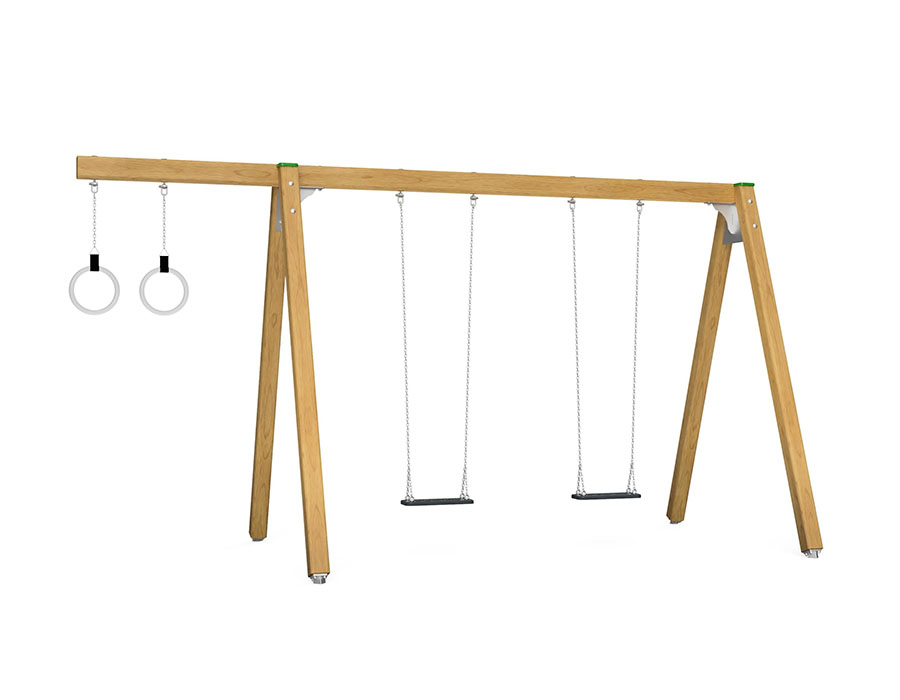 Schaukelgerüst aus mehrfach verleimtem Schweizer Kiefernholz druckimprägniert, mit seitlichen Turnringen, Aufhängevorrichtung aus Edelstahl für zwei Sitze, inkl. Stahlfusskonsolen für minimale Einbautiefe 50 cm.