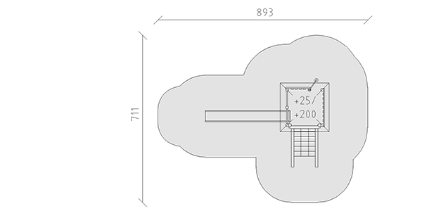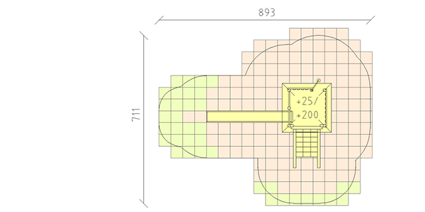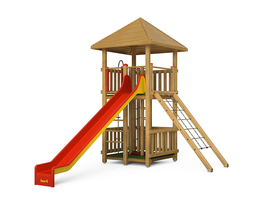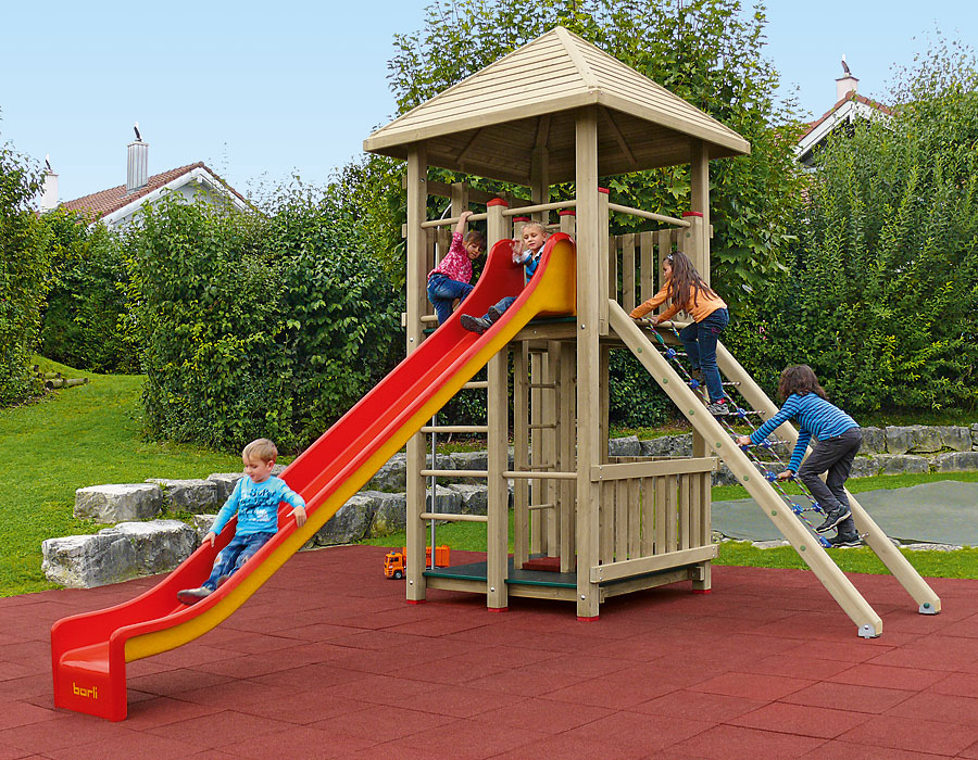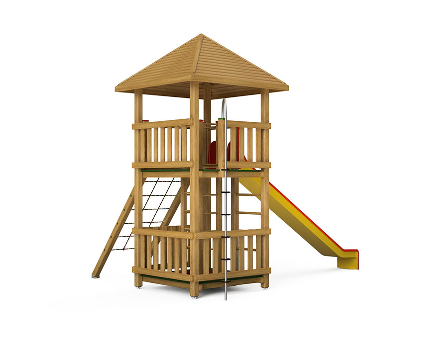 Spielturm-Kombination aus mehrfach verleimtem Schweizer Kiefernholz druckimprägniert, Podesthöhen 25/200 cm, mit Pyramidendach, Rutschbahn aus Polyester rot/gelb, Kletternetzabteil, Kletterstange, inkl. Stahlfusskonsolen für minimale Einbautiefe 50 cm.