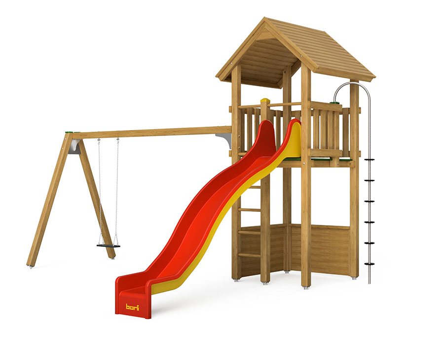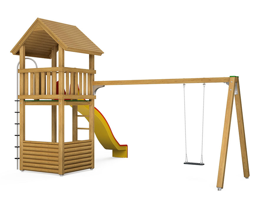 Der Spielturm wird komplett zusammengebaut geliefert. Die Anbauelemente müssen vor Ort befestigt werden.