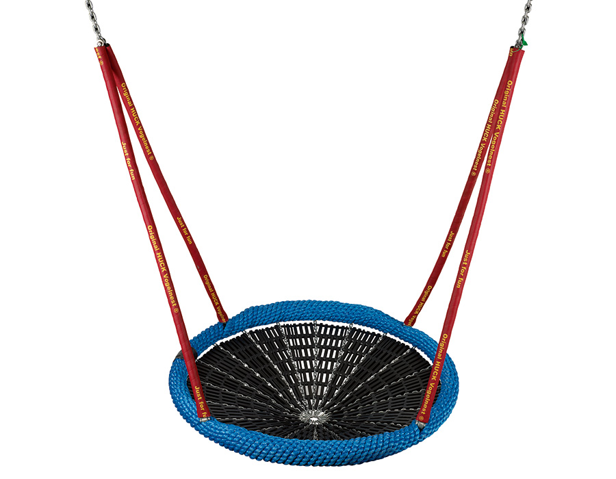 Vogelnest Orignial Huck, Durchmesser ø 125 cm, Matte aus Kunststoffgliedern, Seilringfarbe blau, mit Kettengarnituren feuerverzinkt und Schutzmantel rot.