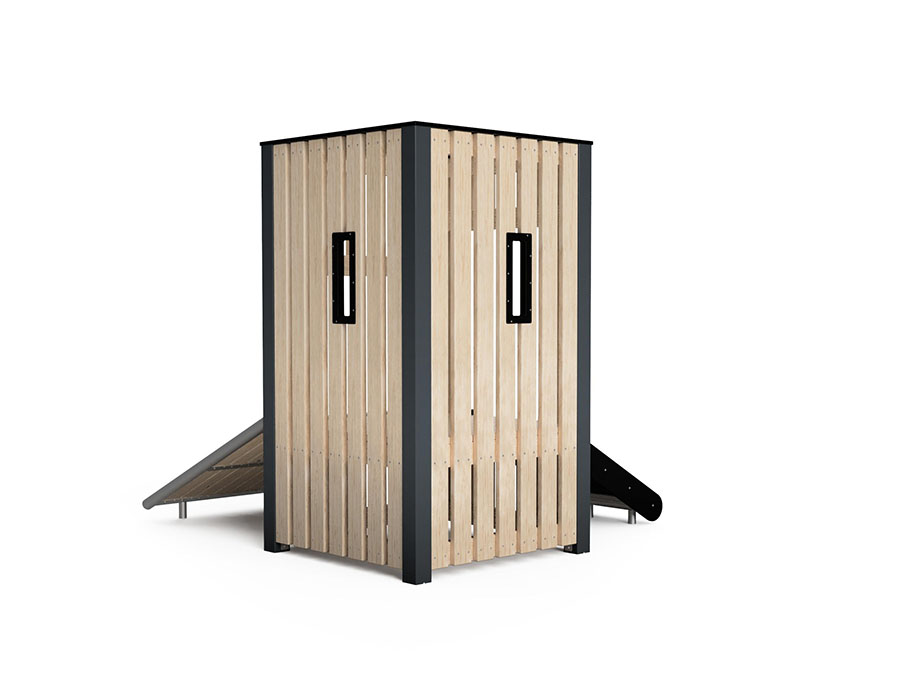 Spielturm-Kombination Sari mit Pfosten in Aluminium, Farbe anthrazit, Brettholz aus Schweizer Lärche roh, Podesthöhe 60 cm, mit Gleitrampe und Aufstiegsrampe, für minimale Einbautiefe 60 cm.