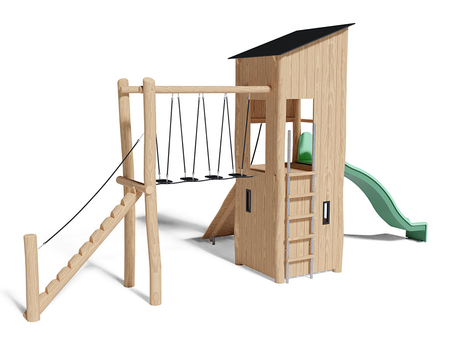 Spielanlage aus chemisch unbehandeltem Robinienkernholz geschliffen, Podesthöhe 180 cm, mit Pultdach, Sprossenaufstieg, Schrägaufstieg, Tellerbrücke, Baumstammaufstieg und Rutschbahn aus Polyester grün/grün.
