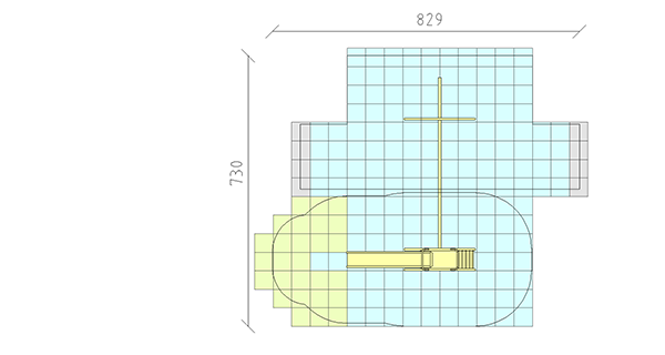 Kombischaukelgerüst aus Stahlrohr feuerverzinkt und zusätzlich rot einbrennlackiert, mit seitlichen Turnringen, Aufhängevorrichtungen aus Edelstahl für ein Sitz, mit seitlich angebauter Rutschbahn aus Polyester blau, minimale Einbautiefe 50 cm.