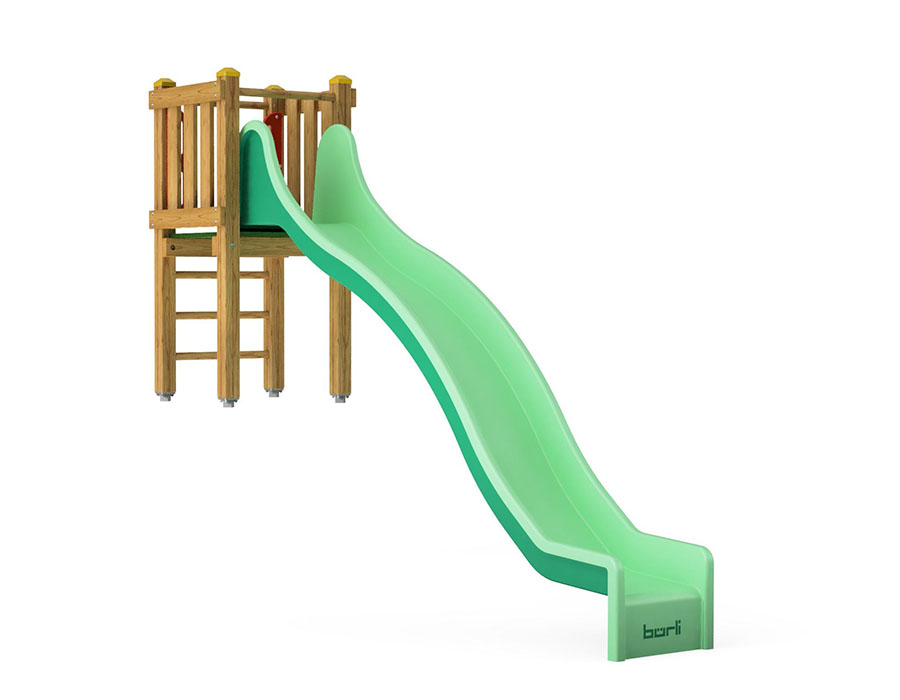Wellenrutschbahn mit Miniturm für Anbauhöhe 180 cm, Wannenlänge 360 cm, aus Polyester grün/grün, eine Welle, Miniturm aus Schweizer Kiefernholz druckimprägniert, mit Podesthöhe 90 cm, inkl. Stahlfusskonsolen für minimale Einbautiefe 50 cm.