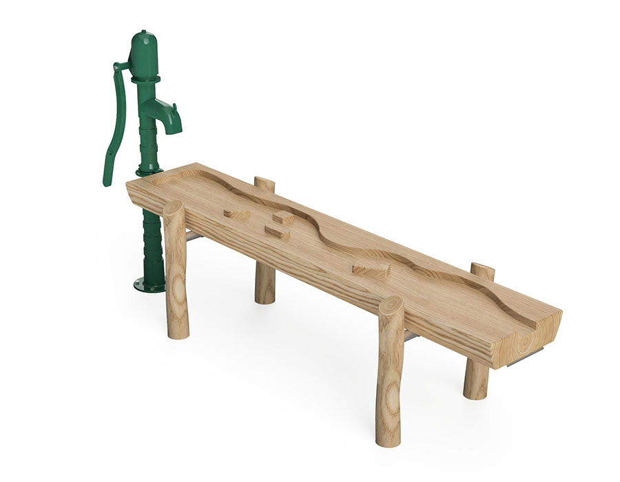 Wasserspiel aus Douglasienholz unbehandelt, mit Schwengelpumpe für Direktanschluss ans Leitungsnetz, Pfosten aus chemisch unbehandeltem Robinienkernholz geschliffen, für minimale Einbautiefe 50 cm.