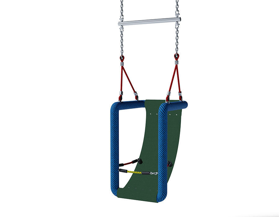 Schaukelsitz Inklusion speziell für Kinder, Jugendliche und Erwachsene mit Handicap, Sitz grün mit Textileinlage, Seilringfarbe blau, mit Kettengarnituren feuerverzinkt.