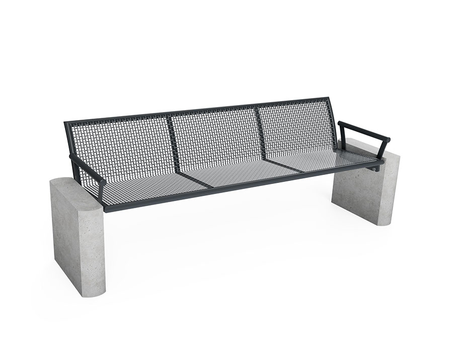 Park bench made of woven wire mesh, additionally lacquered in RAL 7016, length 204 cm, with backrest, brackets made of concrete.