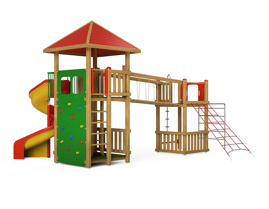 Playtower combination made of multi-glued Swiss pine, pressure impregnated, platform heights 25/180/200 cm, with pyramid roof and aluminium panel infill, stainless steel climbing pole, bent metal ladder, climbing net ascent, suspension bridge, spiral slide made of polyester red/yellow, climbing wall, incl. steel foot brackets for minimum installation depth 50 cm.