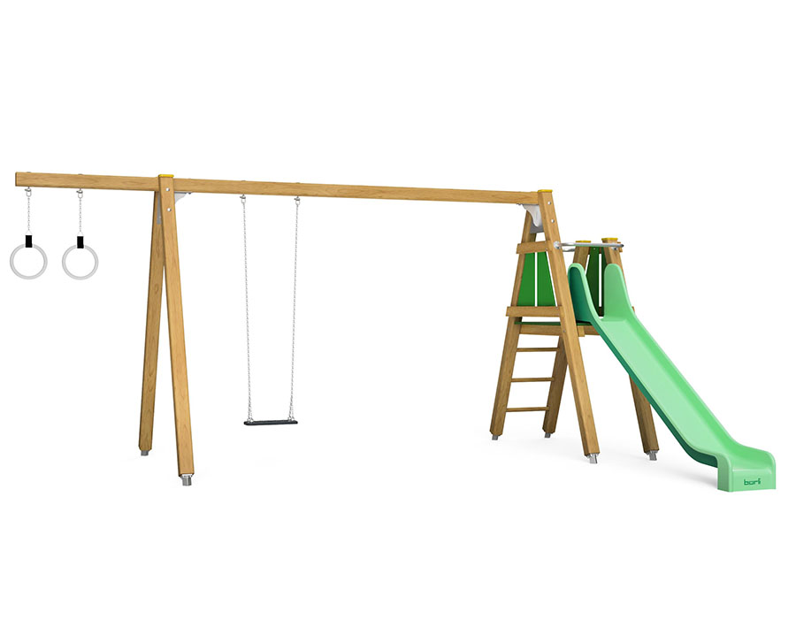 Swing frame combination made of multi-glued Swiss pine, pressure impregnated, platform height 120 cm, slide made of polyester green/green, with side gymnastic rings, stainless steel suspension device for one seat, incl. steel foot brackets for minimum installation depth 50 cm.