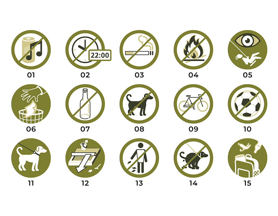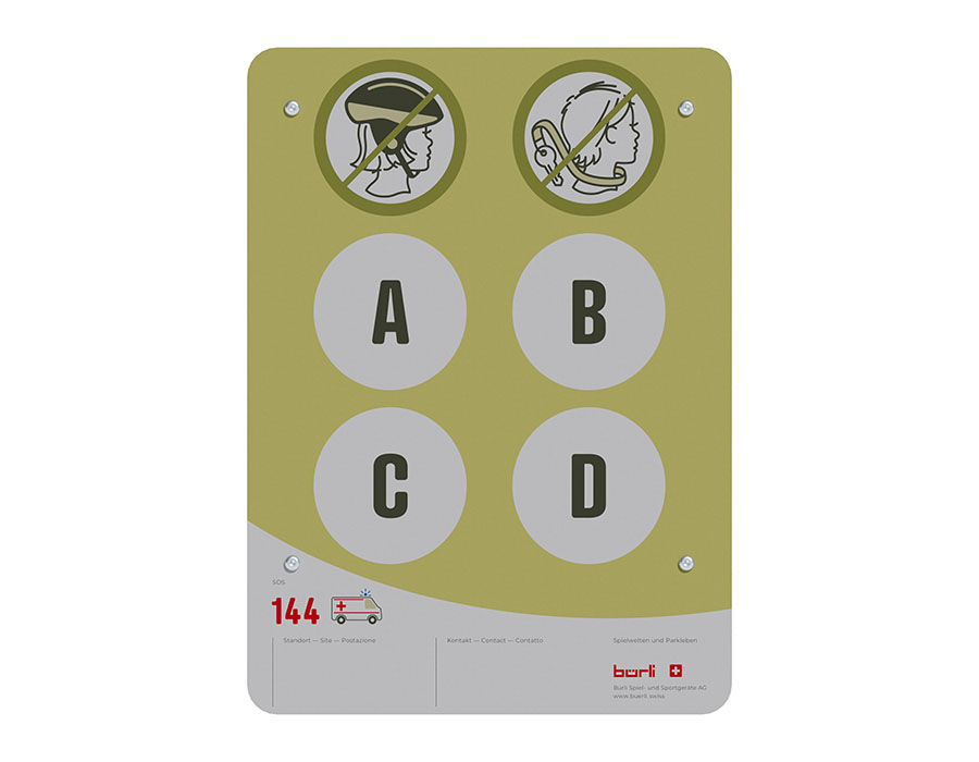 Norm reference According to the SN EN 1176-7:2018 standard, signs must be installed at public playgrounds to draw attention to possible danger. The two symbols "No helmet wearing and no cord wearing" are mandatory and therefore cannot be changed.