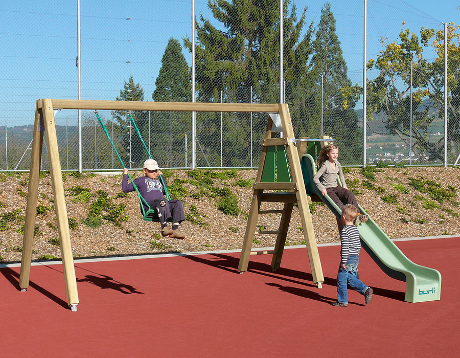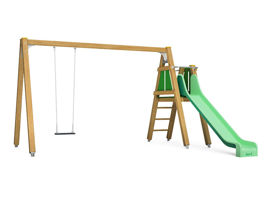 Swing frame combination with slide made of multi-glued Swiss pine, pressure impregnated, platform height 120 cm, slide made of polyester green/green, stainless steel suspension device for one seat, incl. steel foot brackets for minimum installation depth 50 cm.