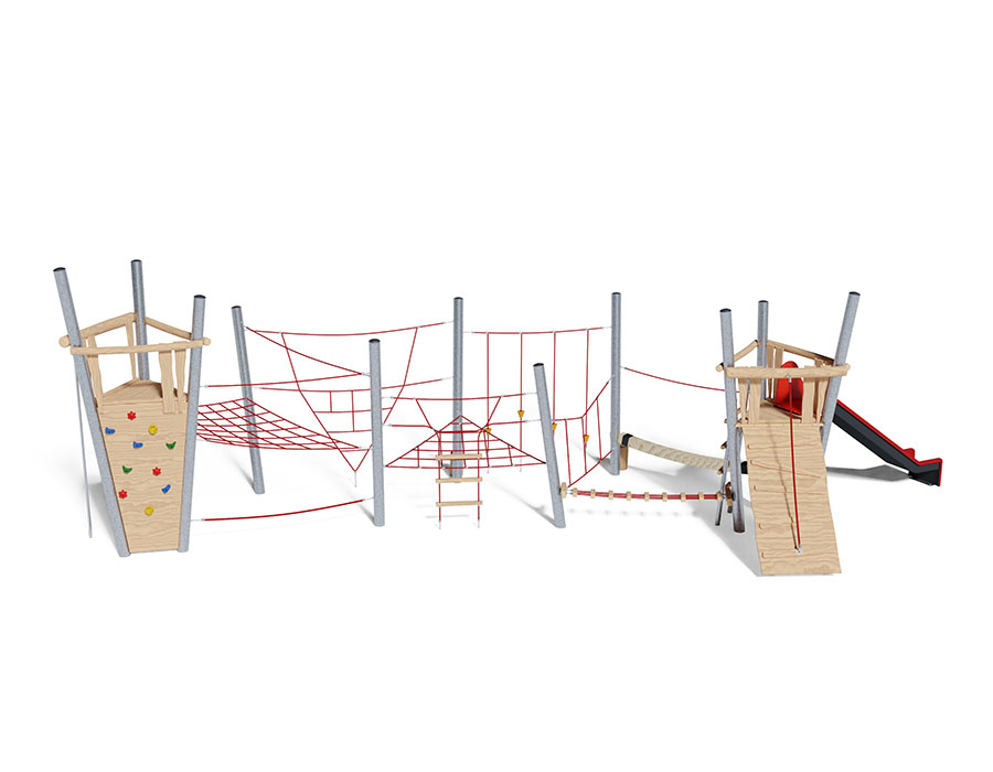 Balancing trail made of hot-dip galvanised steel tubing, suspension devices made of stainless steel, with play towers with platform heights 150 / 200 cm, red/anthracite polyester slide, with rung ladder, inclined ascent, balancing course, climbing wall, stainless steel fireman's pole.