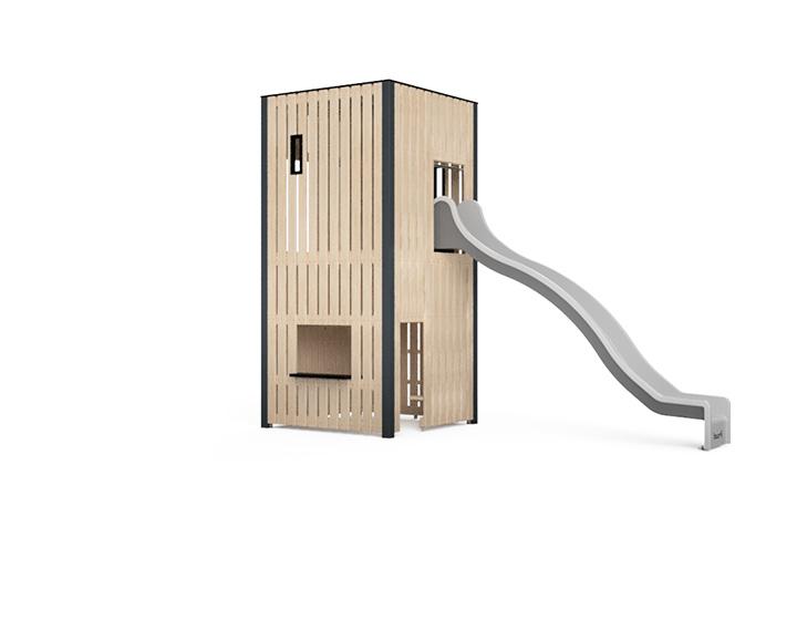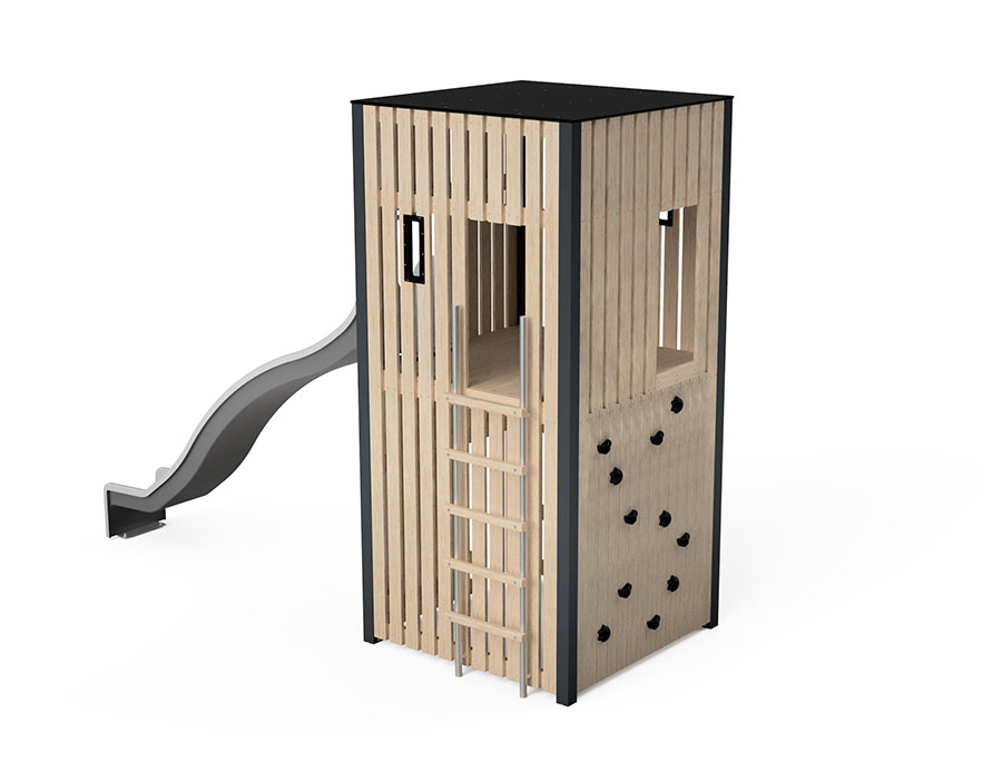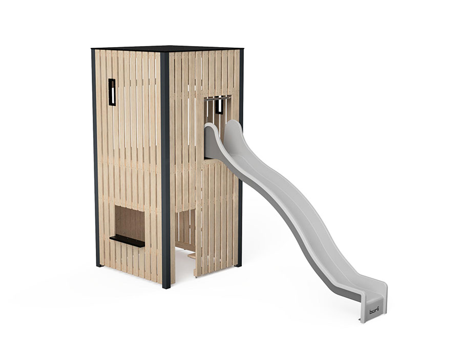 Ensemble de jeux Luka avec poteau en aluminium, couleur anthracite, lattes en bois de mélèze Suisse brut, hauteur de plate-forme 180 cm, avec toboggan en polyester gris/anthracite, échelons de montée, mur d’escalade, comptoir de vente et banc de balustrade, pour profondeur de montage minimum 60 cm.
