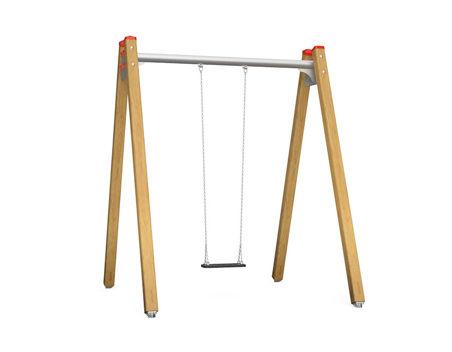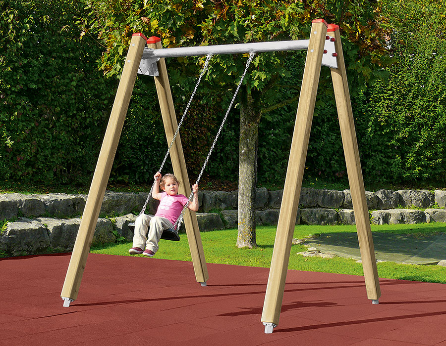 Construction de balançoire en bois de pin Suisse collé et imprégné sous pression, dispositifs de suspension en acier inoxydable pour un siège, angulaires et poutre horizontal galvanisés à chaud, inclus pieds galvanisés à chaud avec profondeur de montage minimum 50 cm.