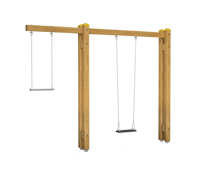 Construction de balançoire en bois de pin Suisse collé et imprégné sous pression, avec trapez lateral, dispositifs de suspension en acier inoxydable pour un siège, inclus pieds galvanisés à chaud avec profondeur de montage minimum 50 cm.