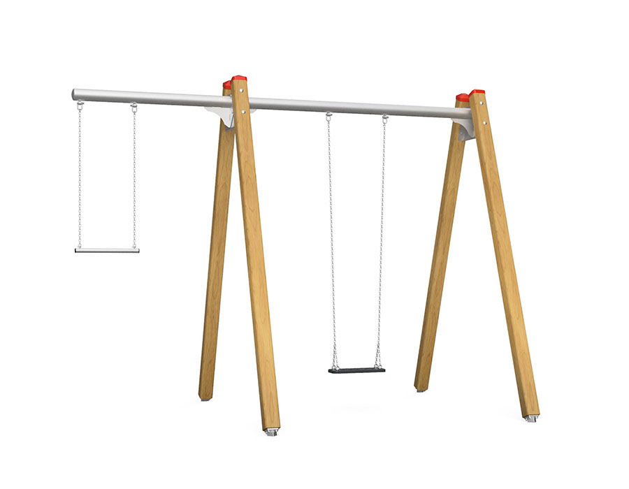 Construction de balançoire en bois de pin Suisse collé et imprégné sous pression, avec trapez lateral, dispositifs de suspension en acier inoxydable pour un siège, angulaires et poutre horizontal galvanisés à chaud, inclus pieds galvanisés à chaud avec profondeur de montage minimum 50 cm.