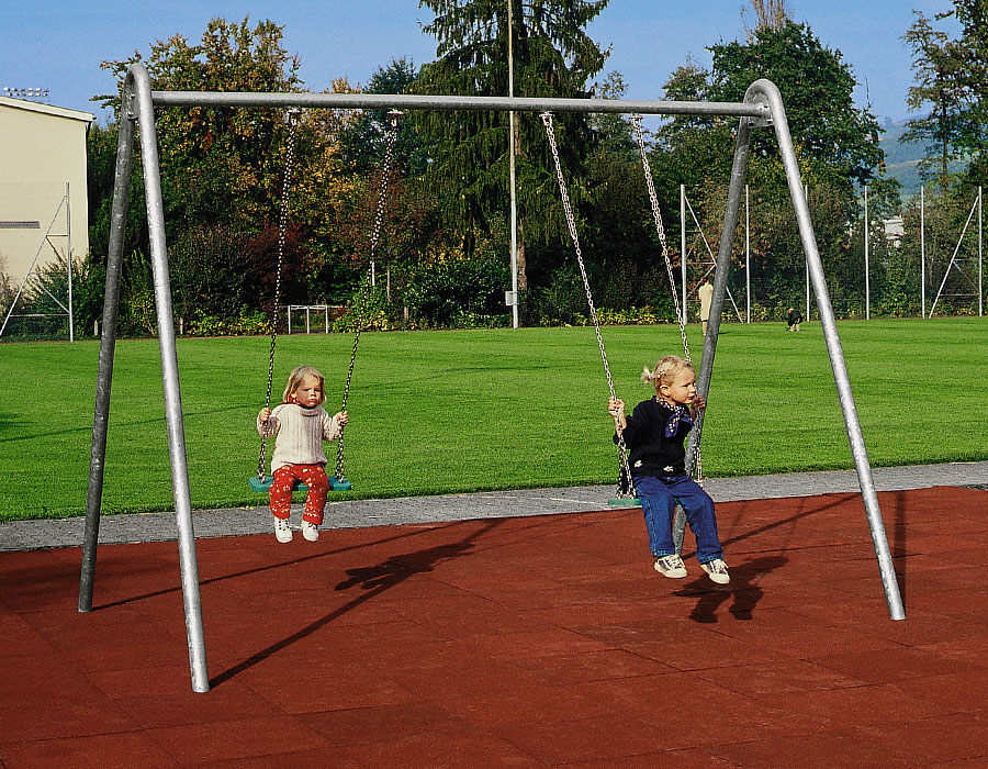 Construction de balançoire en tube d'acier galvanisé à chaud, dispositifs de suspension en acier inoxydable pour deux sièges, profondeur de montage minimum 50 cm.