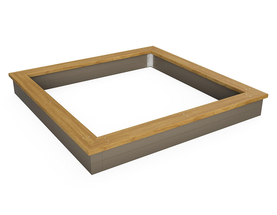 Bac à sable en poutres en matières synthétiques, couleur brune, dimensions 200 x 200 cm, à deux plis, couvertes d'une surface de siège en bois de pin Suisse.
