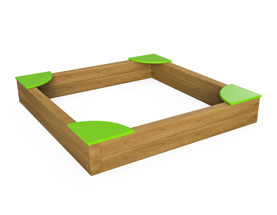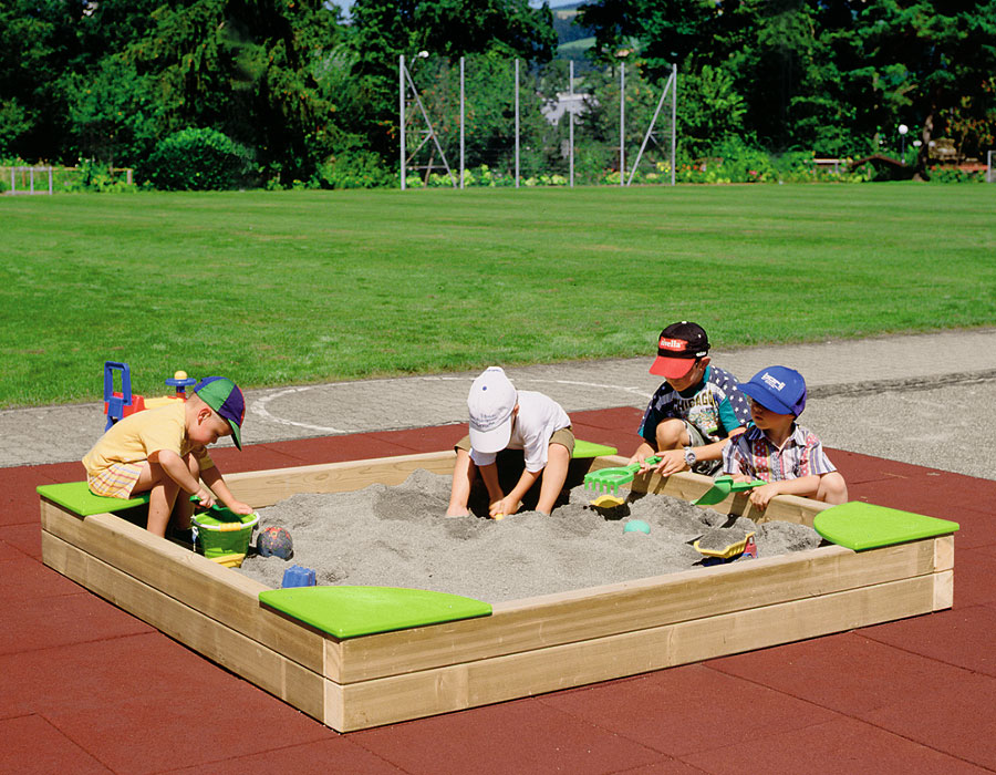 Sabbiera in legno di pino svizzero multincollato e impregnato a pressione, grandezza 150 x 150 cm, travi di legno in due strati con triangoli a sedere di polietilene.