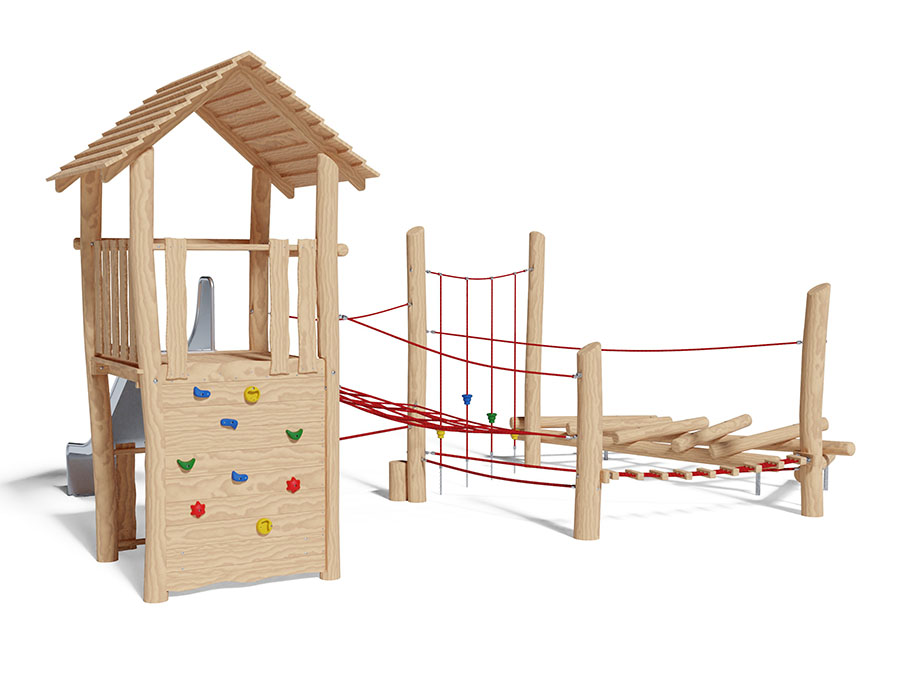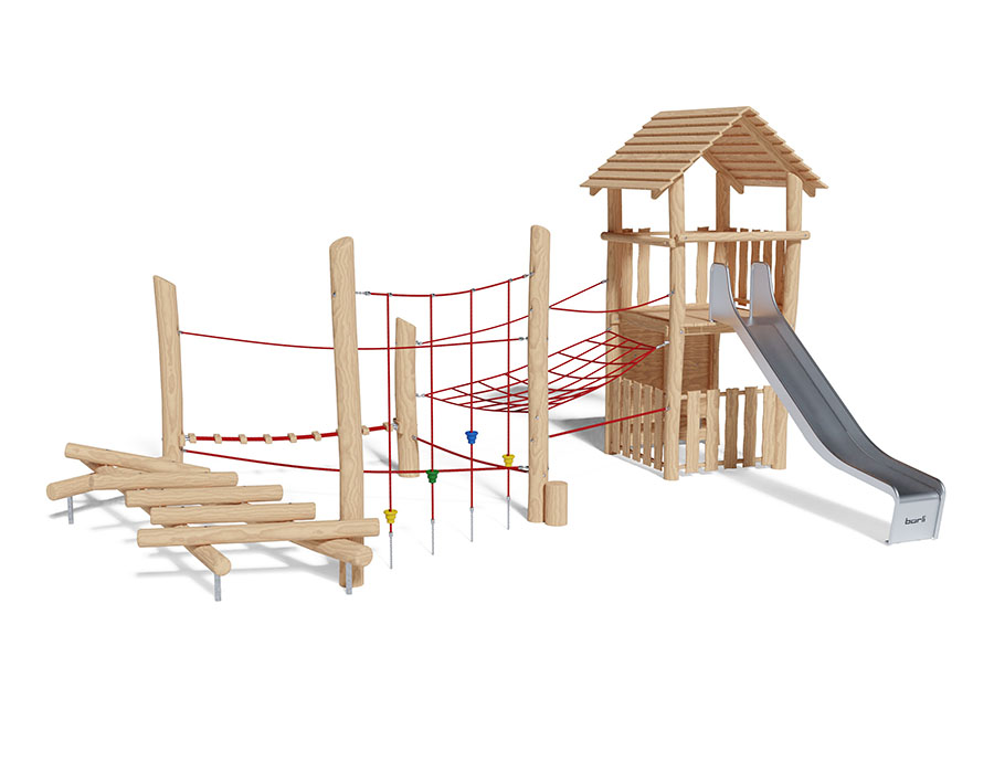 Percorso d'equilibrio fatto di durame di robinia non trattato chimicamente e levigato, con torre di gioco altezza della piattaforma 150 cm e scivolo in acciaio inossidabile, dispositivo di sospensione in acciaio inossidabile, corde mammut in acciaio rinforzato.