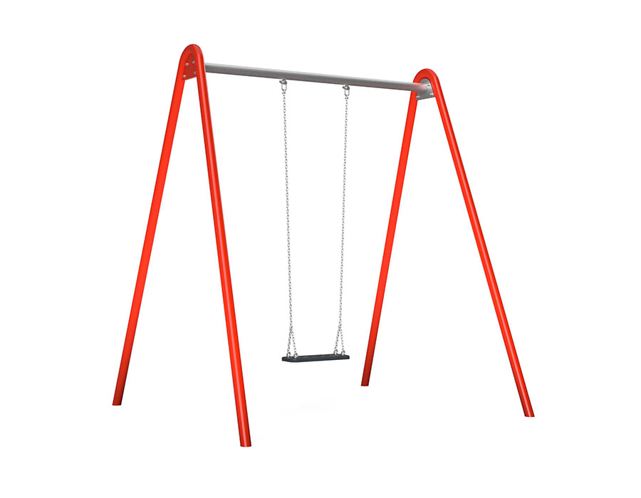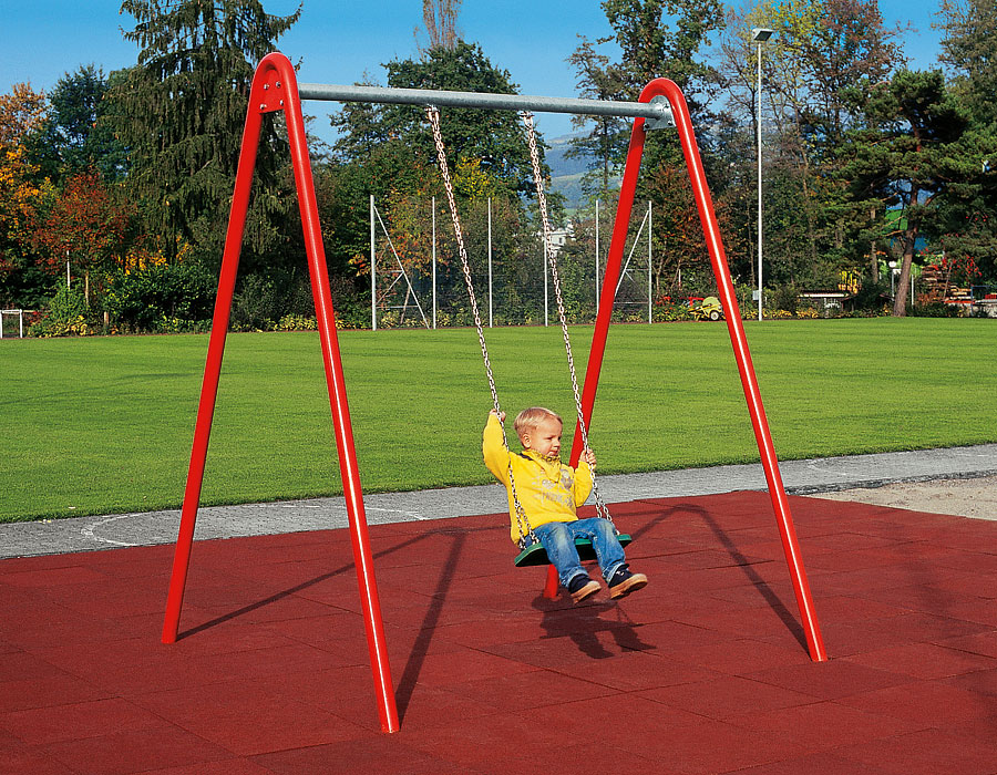 Altalena, costruzione di tubi d'acciaio zincati a fuoco e laccata parzialmente con RAL 3020 rosso, sospensioni d'acciaio inossidabile per uno seggiolino, per una profondità di installazione minima di 50 cm.
