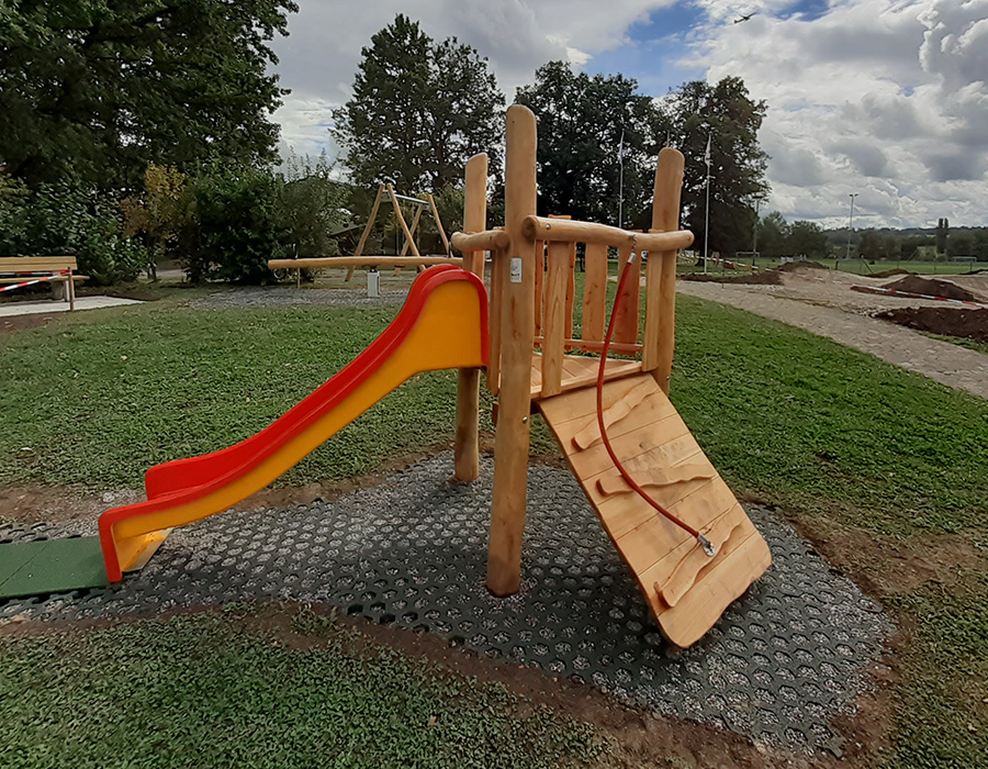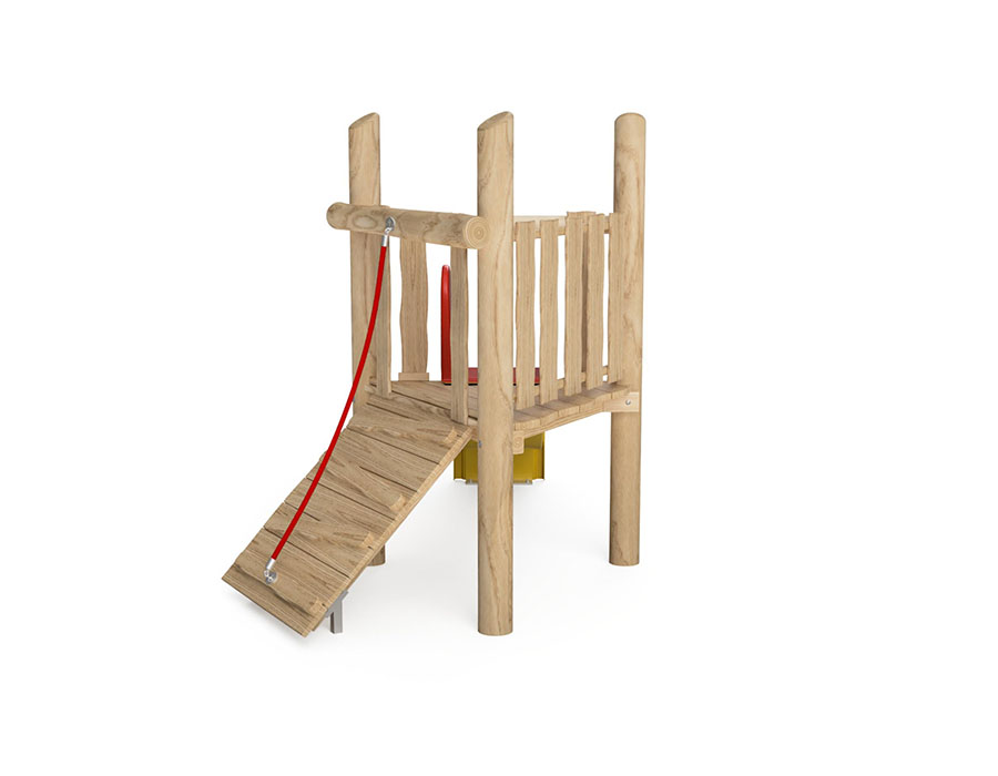 Combinazione di torrete fatto di durame di robinia non trattato chimicamente e levigato, altezza della piattaofrma 90 cm, con ascesa inclinata e scivolo in poliestere rosso/giallo.