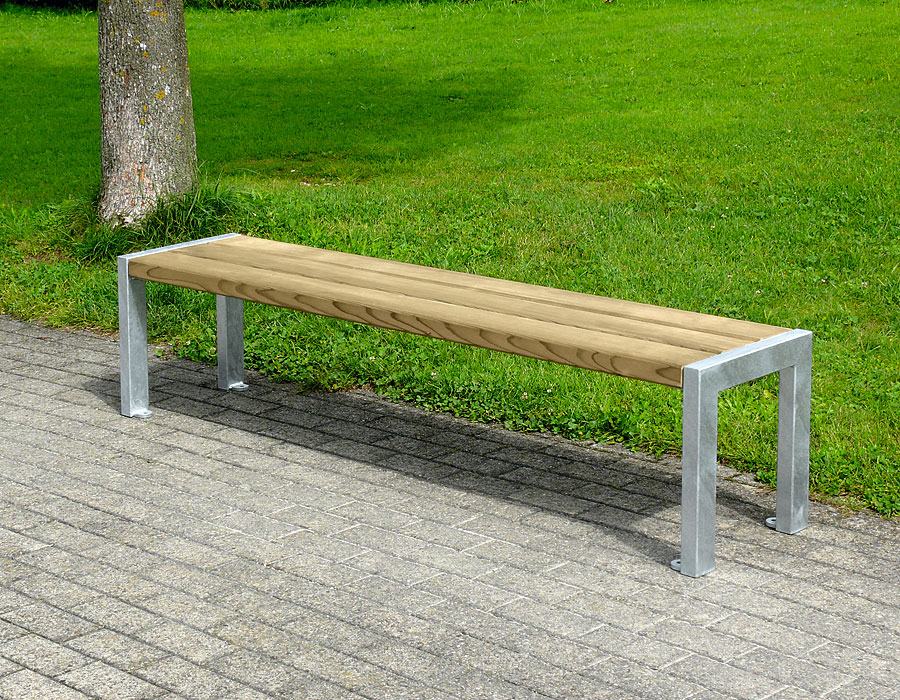 Panchina in legno di pino svizzero multincollato e impregnato a pressione, lunghezza 180 cm, senza spalliera, costruzione in acciaio zincato a caldo.